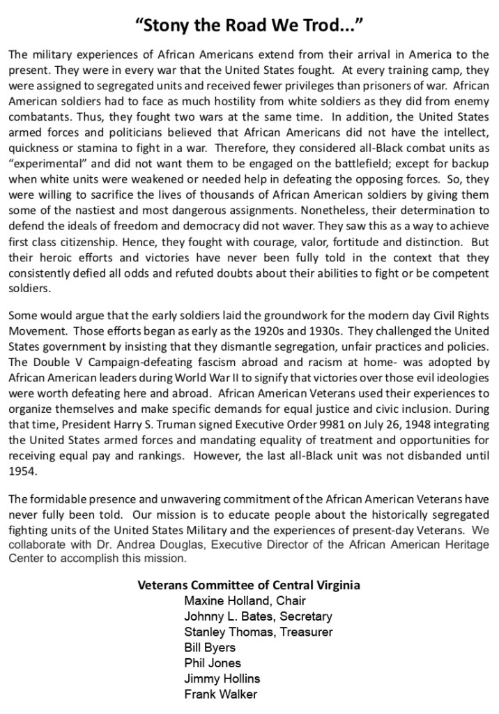 The Vet Committee's mission is to educate people about the historically segregated fighting units of the United States Military and the experiences of present-day Veterans. View all posts by Veterans Committee of Central Virginia